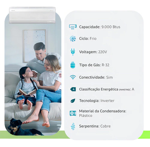 Economize energia como nunca com até 77% de redução no consumo, enquanto a função AI Auto Cooling adapta automaticamente o desempenho para atender às suas preferências com máxima eficiência. Tenha o controle completo ao alcance das mãos com o app SmartThings, permitindo ajustes e monitoramento remoto, além de integração com assistentes de voz como Alexa e Google Assistente.