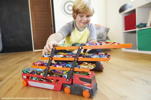 Com capacidade surpreendente, acomoda até 50 carrinhos (escala 1:64) em seus 6 níveis expansíveis — muita diversão e organização garantidas! Possui cabine que abre, com espaço para estacionar mais 2 carrinhos, e painel lateral transparente que se abre, emoldurando os veículos favoritos em destaque.