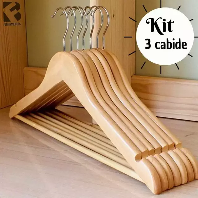 CONTÉM: 01 Kit com 3 Cabides de Madeira com verniz